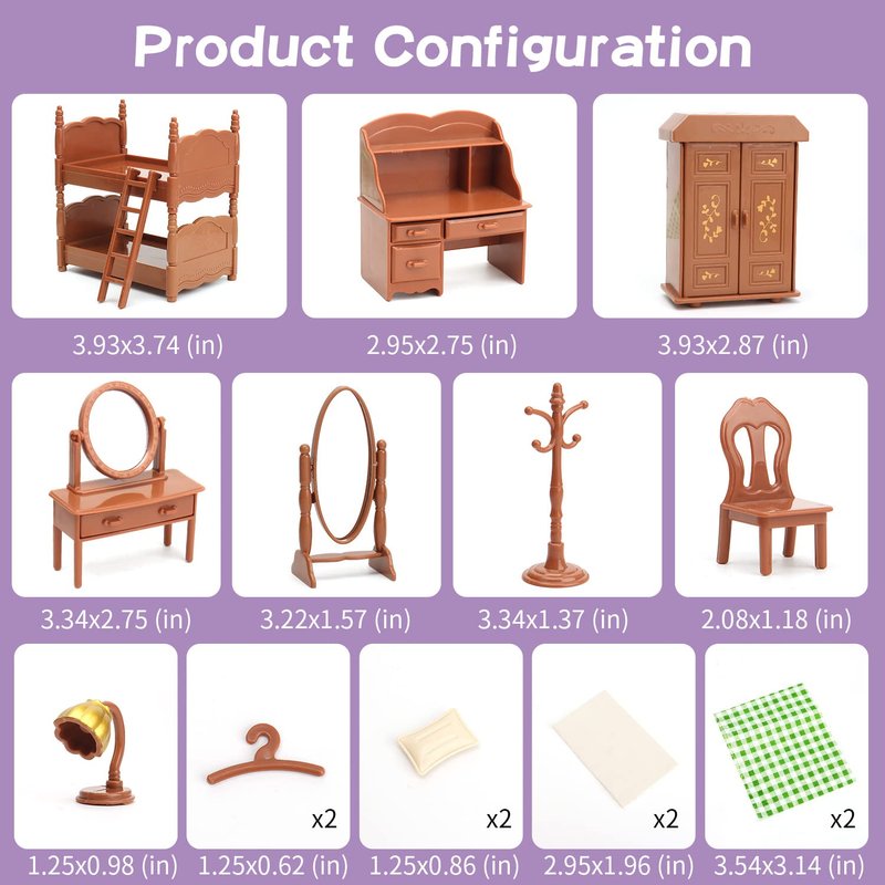 - Dollhouse Furniture set with accessories:Double bed, wardrobe, hangers, dressing table, desk, floor-to-ceiling mirror and other bedroom items etc.