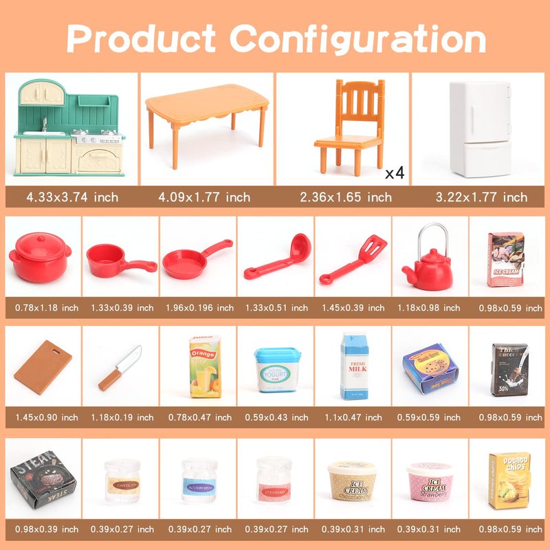 - Dollhouse Furniture set with accessories:Tables, chairs, refrigerators, dishwashing stations and other kitchen items, etc.