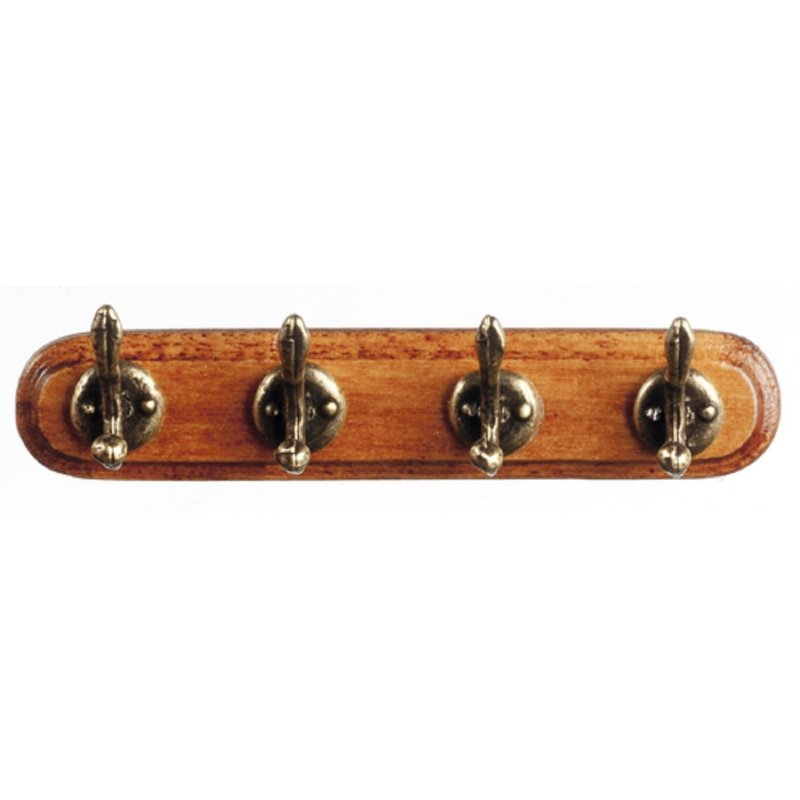 Wall Coat Rack with 4 Hooks by Town Square Miniatures. Designed for the 1:12 miniature scale. Made of wood and metal. Measures: 2 3/16 in wide x 1/2 in tall x 1/2 in deep.