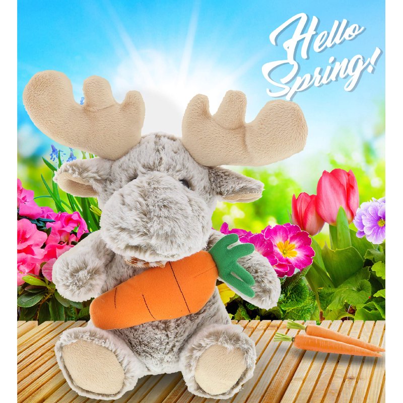- HIGH-QUALITY TEDDY BEAR WITH CARROT - The Super Soft Plush Sitting Moose is a plush toy made of premium quality polyester & stuffed with soft fillings. Covered with beige fluffy fur. A snuggly and cozy wild life toy crafted with durable materials, designed to deliver a Welcome Spring & Happy Easter message to your loved ones in an adorable way. To maintain the cleanliness of the moose plush, surface wash with cold water & allow to air dry.
