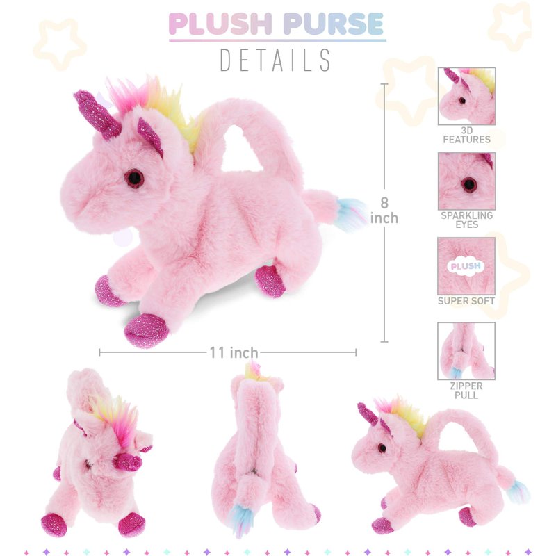 - IDEAL USE FOR THE UNICORN PLUSH ANIMAL PURSE - Plush handbag is an on-the-go stuffed toy purse to store accessories like toys, snacks, coins, hair accessories & school supplies. Super convenient as a child's bag that girls & boys can use to carry their personal things while being able to hug their plush purses. Having a bag teaches children to be responsible for their personal items. Plush purse may also be used for a costume as a dress-up purse.