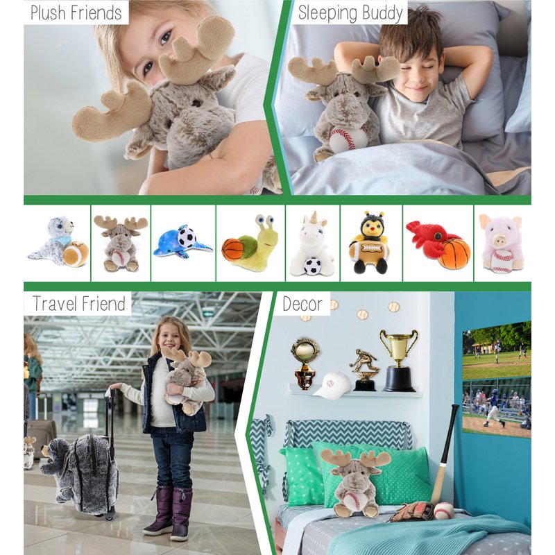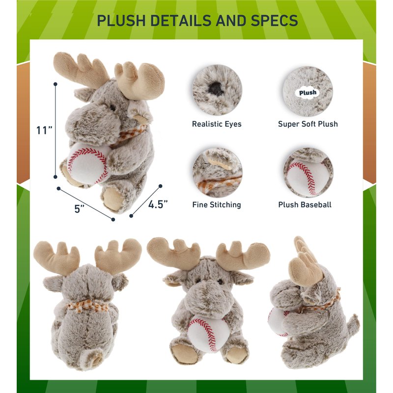 - HIGH QUALITY SUPER SOFT PLUSH MOOSE STUFFED ANIMAL - The machine-sewn moose toy plush and baseball is made of premium-quality polyester, stuffed with soft fluffy polyester fillings. Made with durable and child-friendly features. Cute and snuggly moose sitting down upright. Cute soft toys designed to be your little one's best buddies. To maintain fluffy stuffed animals, wash moose plush toys with cold soapy water and allow it to air dry.