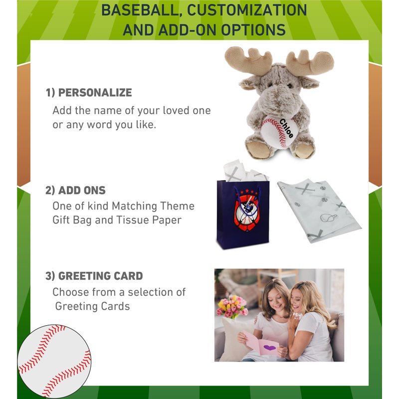 - PERSONALIZATION, CUSTOMIZATION, AND ADD-ON OPTIONS - Super Soft Sports Stuffed Animal Moose comes customized with a Baseball Plush. You can personalize it with the name of your loved one imprinted on the item. You also have the option to add some or all of the cool add-ons to make your gift extra special: 1) Gift Bag; 2) Tissue Paper; 3) Greeting Card.