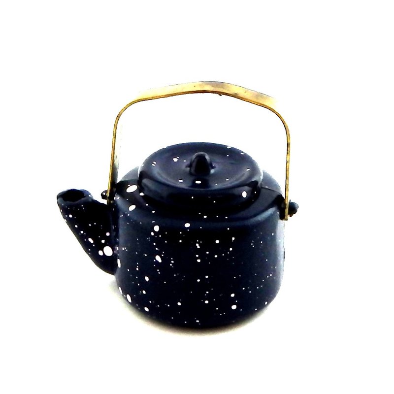 - This shiny blue spatterware metal teapot will make a nice addition to your miniature scene.