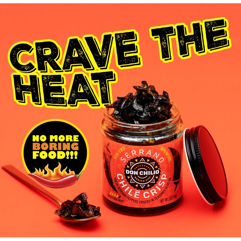- MEDIUM CHILE CRISP TOPPING: Don Chilio’s Medium Mexican Chile Crisp contains selected premium Serrano chiles at their peak of ripeness. The medium mexican chili crisp flavor has a crunchy texture that adds a medium kick to your meal.