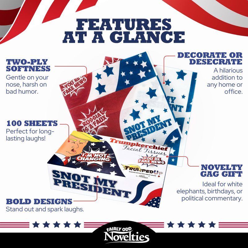 - Make Novelties great again! - Whether you're in the maga crowd or firmly against it, This box of tissues is the perfect Presidential novelty item!