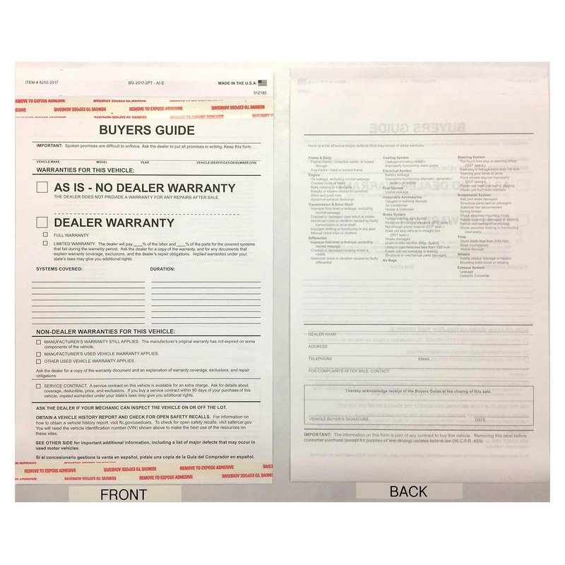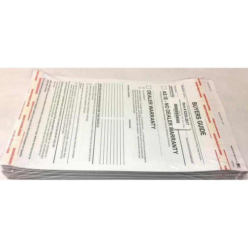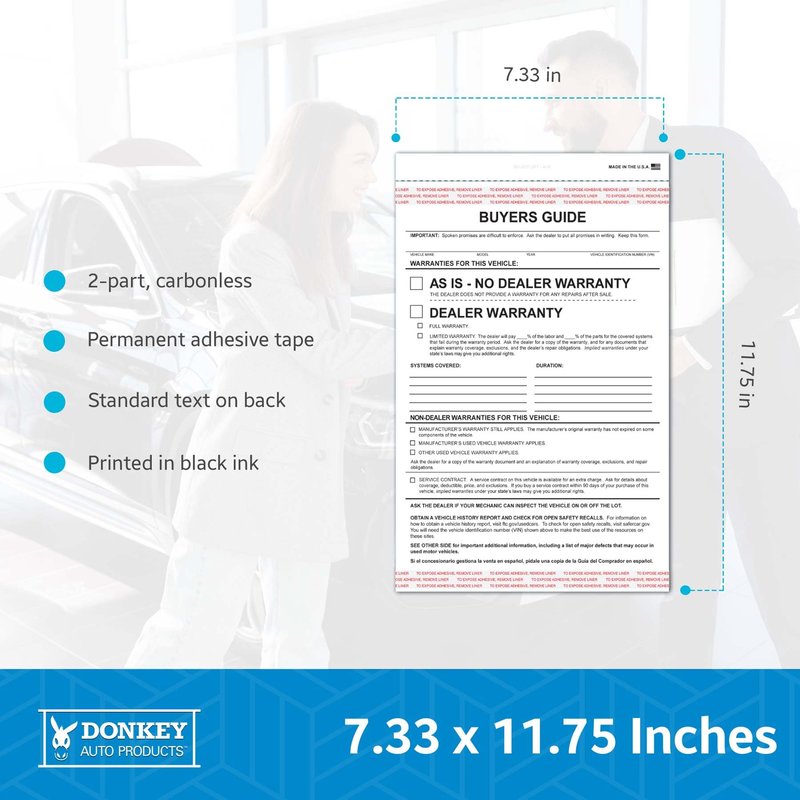 Revolutionize Your Dealership With Our 2-Part Buyers Guide Form - The vehicle buying process can often be a complicated affair. Our Vehicle Warranty Information Form is designed to simplify the process, ensuring a smooth and hassle-free experience for both the buyer and the seller. These forms serve as a comprehensive document, covering all necessary information regarding the car warranty, thus fostering a trustful relationship between the dealer and the customer. Our Auto Dealership Form stands out due to its carefully considered dimensions of 7.33 x 11.75 inches. The size allows it to fit perfectly into any workflow, ensuring that it does not disrupt your daily operations. It is printed in bold, black ink, ensuring the text is clear, legible, and difficult to alter. This eliminates any room for misunderstandings or discrepancies. Standard buyers guide text is on the back. The Car Warranty Form is designed with convenience in mind. It features adhesive tape at the top and bottom, allowing it to be securely attached to the inside of a vehicle window. It is also 2-part carbonless, meaning it provides clean and clear copies, eliminating the need for manual entries and reducing the risk of errors. One of the standout features of our Automotive Sales Document is the detailed content. The main text area features 'As Is - No Dealer Warranty / Dealer Warranty,' offering complete transparency and protection for all parties involved. It also includes lines for additional warranty text and Non-Dealer Warranties, catering to all potential scenarios. Last but not least, the Used Car Warranty Form comes in packs of 100, offering optimal convenience and easy storage. This makes it ideal for busy dealerships that handle a high volume of transactions. In addition, it is compatible with Form # BG-2017-2PT-AI-E, ensuring consistency across your documents.