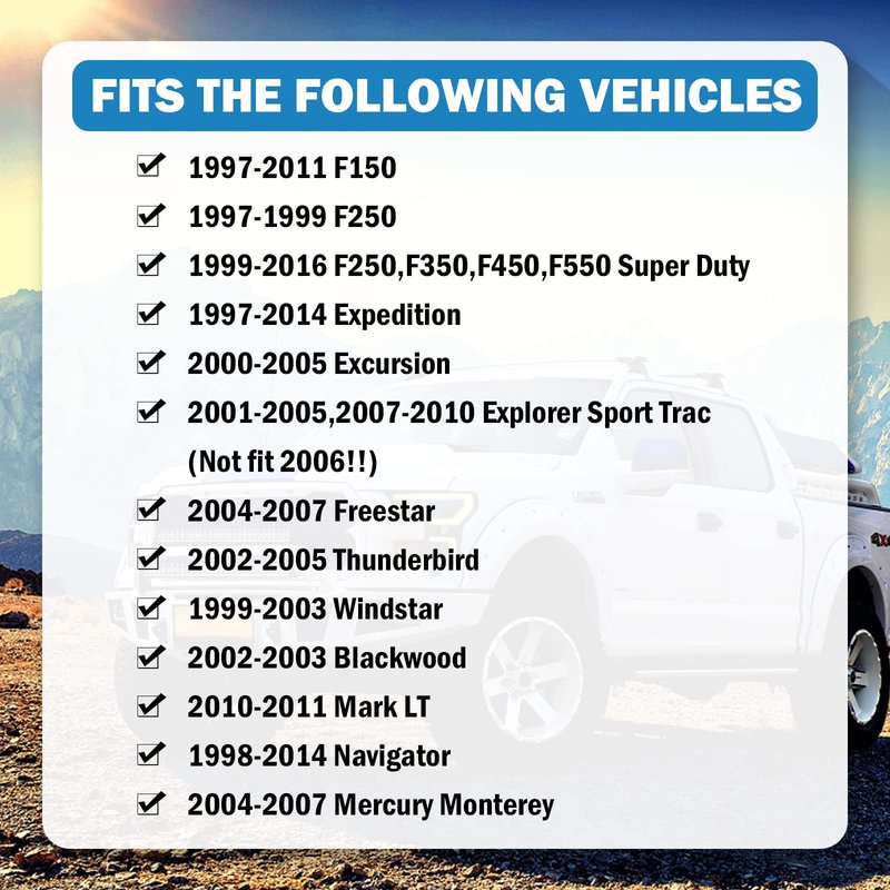- FITMENT - Compatible for F150 1997-2011; F250 1997-1999; F250,F350,F450,F550 Super Duty 1999-2016; Expedition 1997-2014; Excursion 2000-2005; Explorer Sport Trac 2001-2005,2007-2010 (Not fit 2006!!); Freestar 2004-2007; Thunderbird 2002-2005; Windstar 1999-2003; Blackwood 2002-2003; Mark LT 2010-2011; Navigator 1998-2014; Mercury Monterey 2004-2007