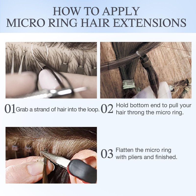 b. How to install Micro link hair extensions?Take a strand of your own hair and pass it through the microbead with a crochet, then use tweeters to clamp the microbead to complete the installation.