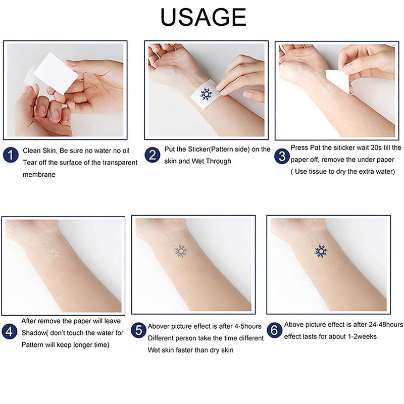Thank you for choosing our temporary tattoos for our adult men women. We could provide you with all kinds of temporary tattoos. And we will update new items frequently, there will always be patterns you like. You can also contact us to tell us which pattern you like, and we will produce it for you.Features:Fashionable, realistic, waterproof and long lasting.Package:Includes 6 highquality temporary tattoo stickers.Size:9.5x9.5cm3.7 X 3.7Instructions:1. Clean the skin.2. Remove the transparent protective film, put the paper side down and stick it to the skin.3. Wet the tattoo paper completely, and then wait for 2030 seconds.4. Remove the paper and let the tattoo dry. Your tattoo is complete.If done in the correct way, temporary tattoos can be kept for 35 days or longer.Remove:Use a small amount of alcohol on the tattoo, wait for about 10 seconds, and then gently wipe with more alcohol until it is removed.