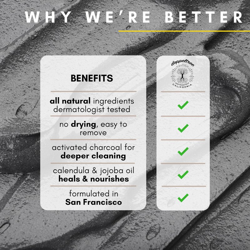 Formulated in San Francisco, at Doppeltree weβre all about all natural organic ingredients. Our mud mask is made using a combination of Dead Sea mud and bentonite clay, plus activated charcoal and other nourishing ingredients. This unique blend is especially effective for combination skin, because it clarifies the skin and tightens the pores, while also loading the skin with moisturizing oils and extracts.