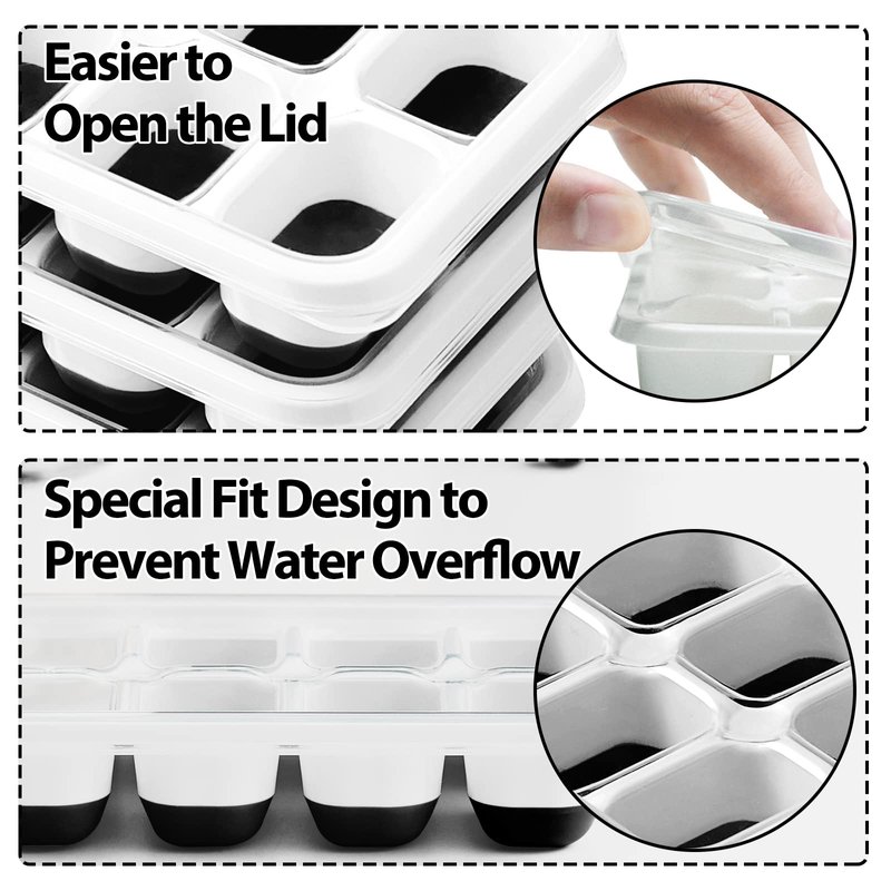 - Lids Lifter Designed: So as to be more convenient to use removable lids, each cover is designed with two lid lifter. This humanized ice tray allows you to make perfect size ice cubes while preventing spills and the freezing of excess water and keeps ice cubes from absorbing freezer odors. Moreover, these easy-release trays stack easily and neatly in the freezer without sticking. Each tray makes 14 nice-sized cubes for a total of 56 (Each capacity of 27 ml).