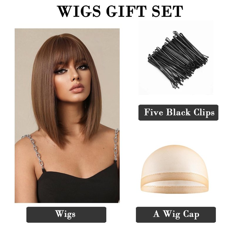 - Wig Gifts for Women:A bob short brown straight wig with bangs,wigs size:12 inches;1 pcs HD wig cap;Five small black clips