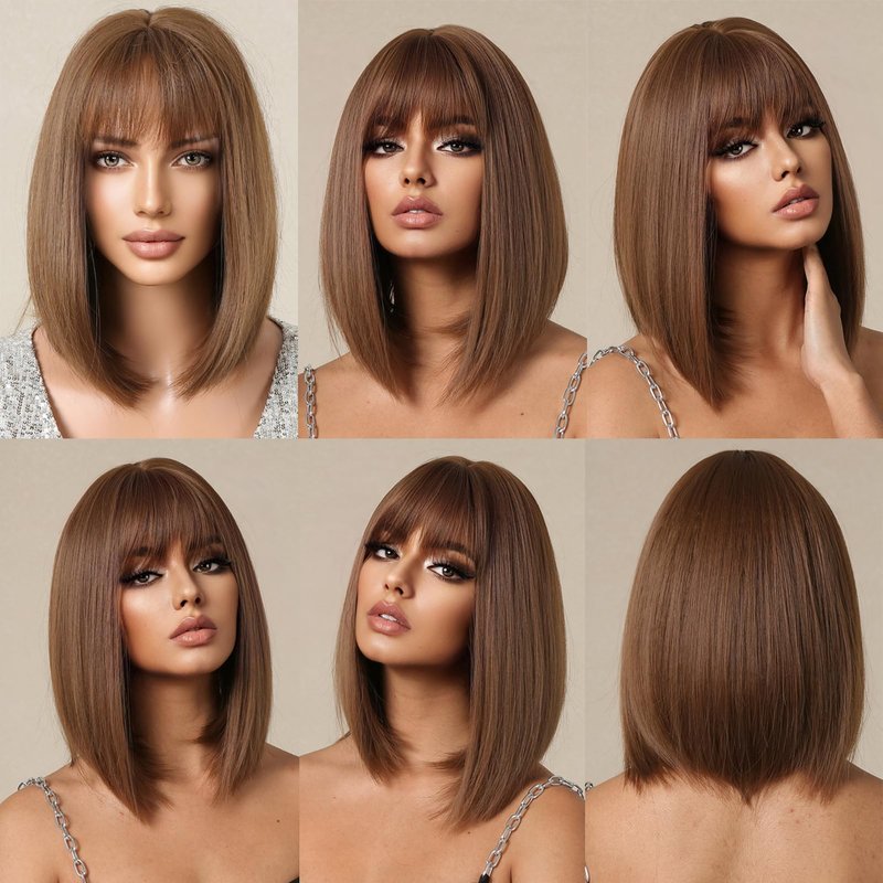- Re-owning the New Hairstyle Wigs:This beautiful brown wigs with bangs can be used not only as a daily use,but also for cosplay parties,showing your confidence and beauty in minutes;Also it will bring you more surprises,you can trim the bangs or the length of the wig as you like.And it can be dyed and permed,the temperature is controlled under 150 ℃,you will regain the stylish short straight wig