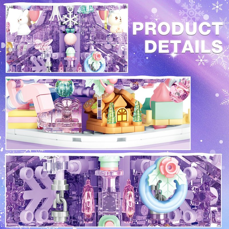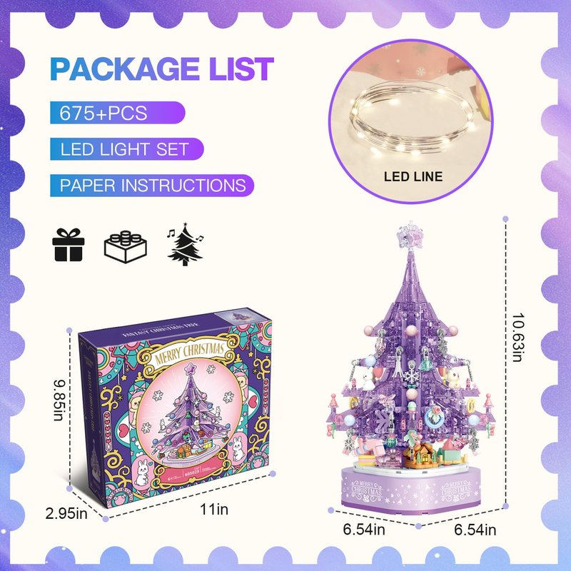 - Purple Crystal Christmas Building Blocks Set:Unique crystal Christmas tree design,Contains 675 Pieces components, an LED light kit (does not include battery)and a full-color instruction book. Come and build a beautiful Christmas tree. You can hear wonderful Christmas music by rotating the key and add a festive atmosphere to you.