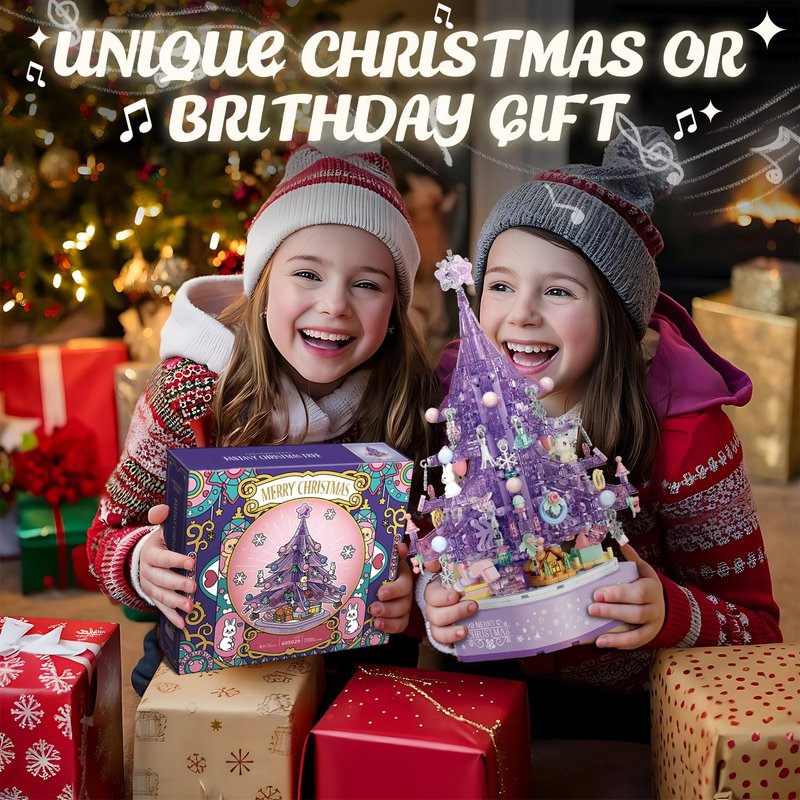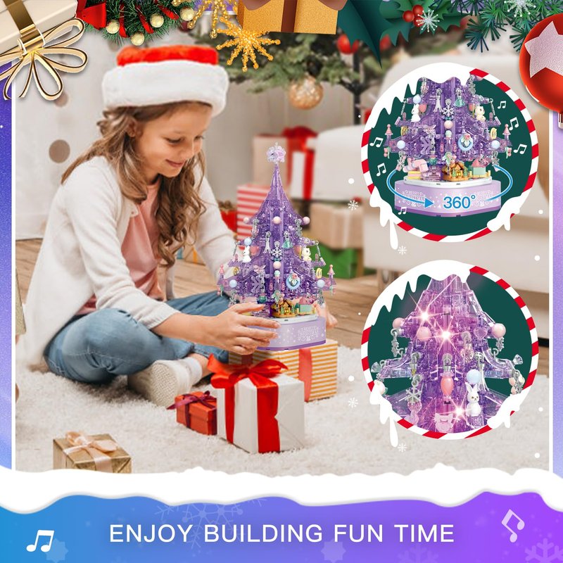 DOSCOR Purple Crystal Christmas Tree Building Blocks Set,Christmas Music Box with LED Light,Xmas Gift for Girls,Kids,and Adults