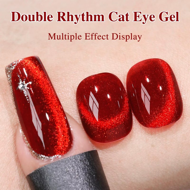 - Cat Eye Gel Nail Polish : Double Rhythm cat eye gel nail polish kit includes 1 color 15ml / 0.5 fl.oz gel nail polish. The cat eye gel can be combined with different bacse colors arbitrarily, you can get different colors nail art.You can use different base coat to creat different sytles.