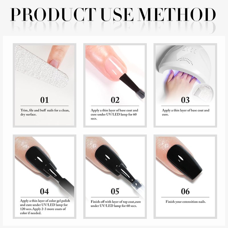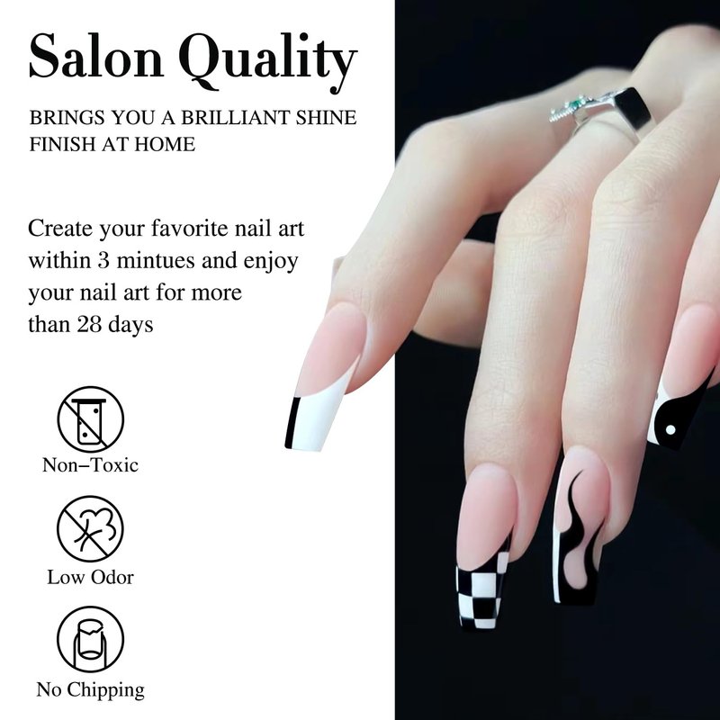 - Double Rhythm GEL POLISH: you will get 2 pcs 15ml gel nail polish with Pure white And pure black color , need to be cured under UV or LED Lamp for 60-120s. Must apply with Base Gel and Top Coat. Please shake the bottle or warm it with hot water before use, to achieve a better effect.