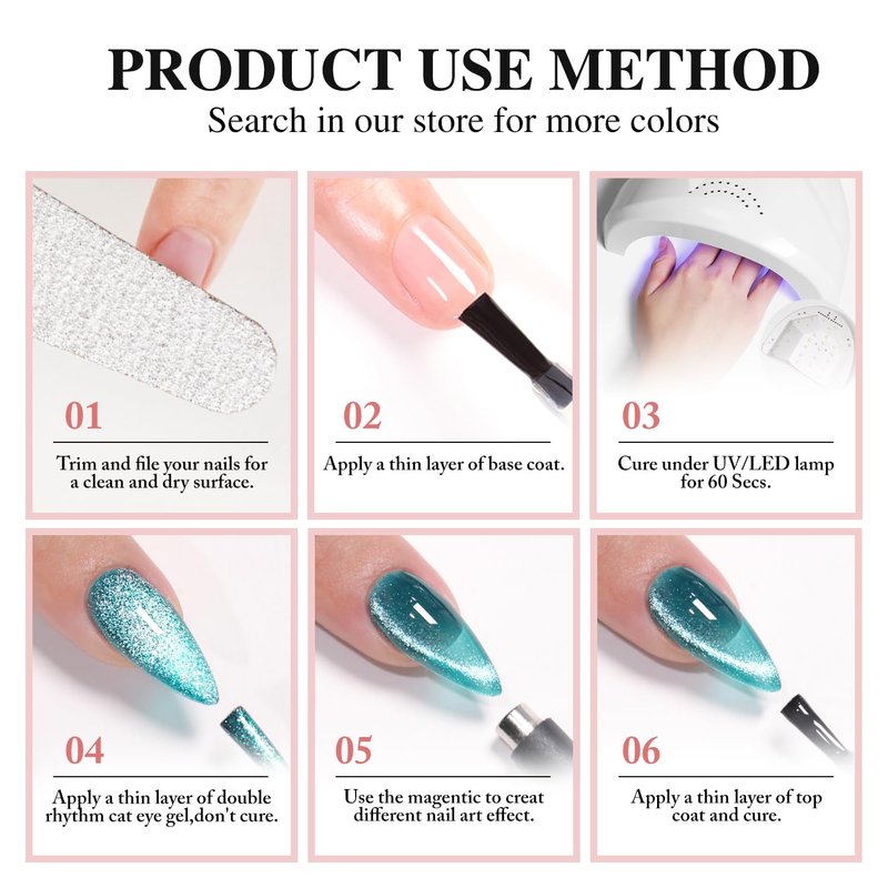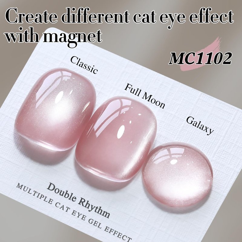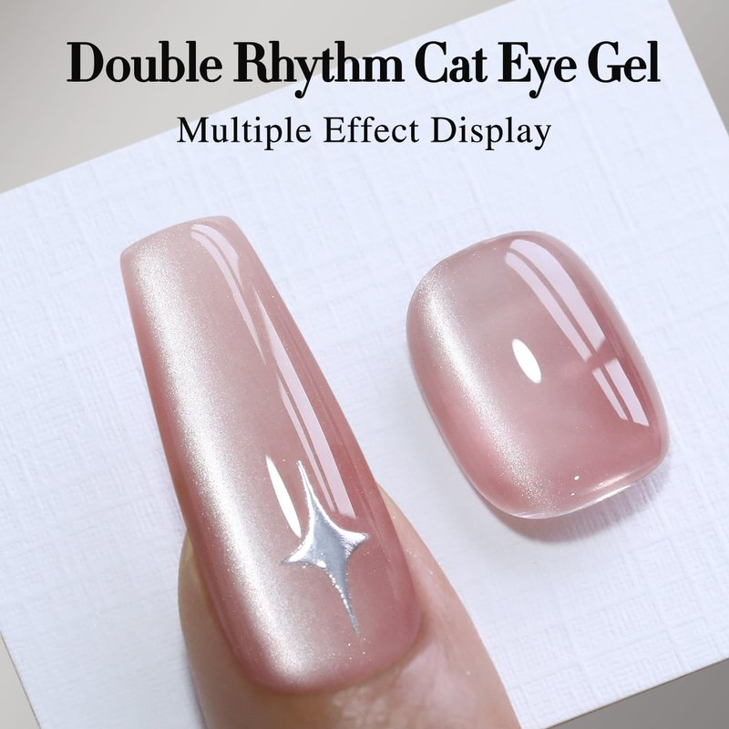 - Cat Eye Gel Nail Polish : Double Rhythm cat eye gel nail polish kit includes 1 color 15ml / 0.5 fl.oz gel nail polish. The cat eye gel can be combined with different bacse colors arbitrarily, you can get different colors nail art.You can use different base coat to creat different sytles.