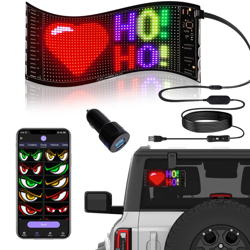 - 【Colorful Lighting】The scrolling LED sign features a unique double-row display design that can show more information simultaneously,The programmable car LED sign is a 24 X 48 pixel full-color LED display, adopts 2121 RGB lamp beads. This high-quality LED matrix panel can not only emit high-intensity light, but also with low power consumption, and the full-color effect is brighter and soft without glare.
