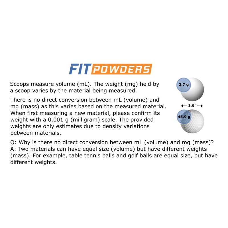 - MG AND ML MEASUREMENT: Micro scoops have the ability to measure both mL and mg. The provided weight estimates are intended to be used as approximate guidelines only due to density variation between different powders or other materials. For example, a table tennis ball has roughly the same volume as a golf ball, but they have different weights. When first measuring a new material, please confirm its weight with a 0.001 g (milligram) scale.
