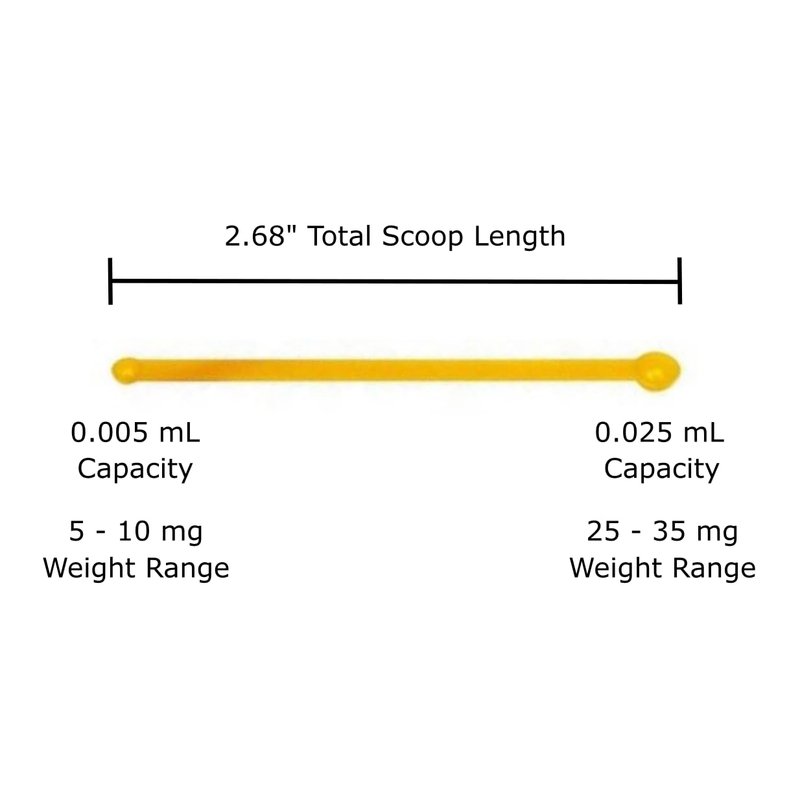Conveniently measure milligram amounts of powder with these double-sided scoops. Depending on powder density, 1 side of the scoop will measure between 5 mg and 10 mg, and the other side will measure between 25 mg and 35 mg. These scoops are ideal for supplement powders, nootropics, or lab work. Total scoop length is 2.75 inches.