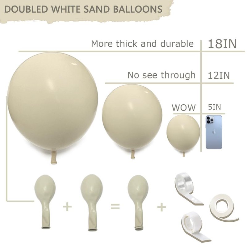 - DOUBLE STUFFED BEIGE BALLOONS SET - Package includes 5 pcs 18 inch double stuffed white sand balloons and 30 pcs 12 inch double layer pastel white balloons, 20 pcs 5 inch doubled beige balloons, 55 pcs in total. In addition, If you want to make a large balloon arch, it is recommended that you buy 2 or 3 sets, we also offer you 1 roll of 16.5 feet white balloons strip tape, 1 roll of 100 balloons glue,1 balloon chain each set.