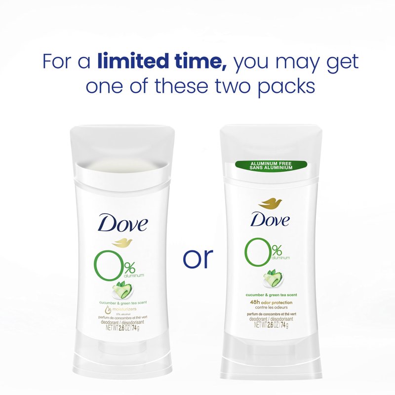 Dove 0% Aluminum Deodorant Stick Cucumber and Green Tea 4 Count Non-irritating Deodorant for Underarm Care Kindest Aluminum Free Deodorant 2.6 oz