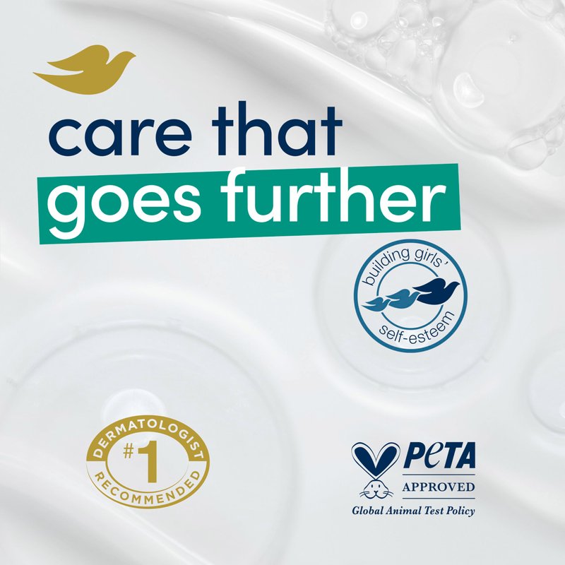 - CARE WITH YOUR CLEANSER: Globally, Dove does not test on animals and is PETA Approved. Our mission is to help the next generation of women develop a positive relationship with the way they look, helping them raise their self-esteem.