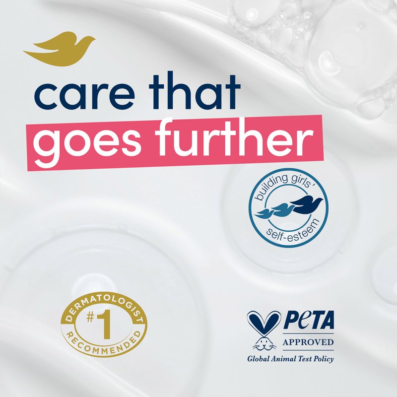 - CARE WITH YOUR CLEANSER: Globally, Dove does not test on animals and is PETA Approved. Our mission is to help the next generation of women develop a positive relationship with the way they look, helping them raise their self-esteem.