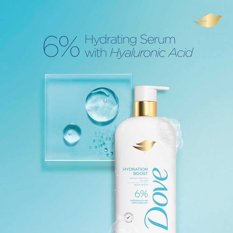 Dove Body Wash Hydration Boost Actively drenches dry skin 6% hydration serum with hyaluronic 18.5 oz