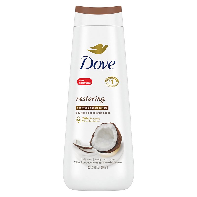 Dove Body Wash Restoring Coconut & Cocoa Butter for Renewed, Healthy-Looking Skin Gentle Skin Cleanser That Effectively Washes Away Bacteria While Nourishing Your Skin 20 oz