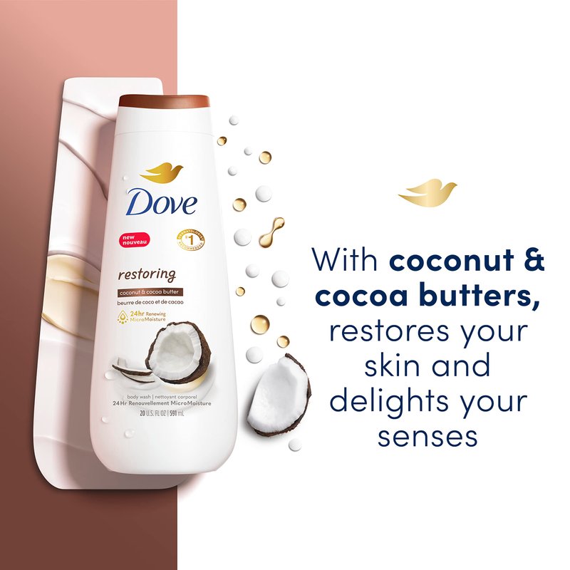 - 24HR RENEWING MICROMOISTURE: Dove Restoring Coconut & Cocoa Butters Body Wash gently cleanses and nourishes the skin, leaving it renewed and healthy-looking for 24 hours