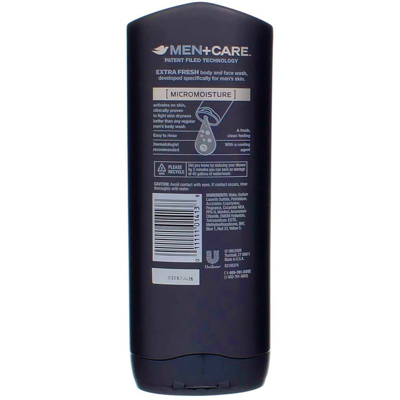 For a refreshing clean that leaves skin feeling healthy and hydrated, add Dove Men+Care Extra Fresh Body and Face Wash to your shower regimen. Uniquely formulated for menâ€s skin by the #1 Dermatologist Recommended brand, this menâ€s body wash with micromoisture technology hydrates for healthier, stronger skin and is clinically proven to fight dry skin better than regular menâ€s body wash. The ultra-light formula activates when lathering, helping to hydrate skin and protect it against dryness and leaving a clean, crisp scent. With an effective, easy-to-rinse formula, this menâ€s shower gel delivers extra refreshment and total skin comfort and is hypoallergenic, noncomedogenic, and gentle enough to use on your face. Specifically designed for menâ€s skin, this Dove Men+Care body wash helps to lock in your skinâ€s natural moisture and leaves your skin feeling clean, hydrated, healthy and protected against dryness. Part of the Dove Men+Care Extra Fresh range, it contains menthol to deliver cooling refreshment to your face and body and provide a refreshing start to the day. To start your shower with long-lasting freshness, choose Dove Men+Care Extra Fresh Body and Face Wash. Ingredients Water, Sodium Laureth Sulfate, Petrolatum, Acrylates Copolymer, Fragrance, Cocamide MEA, PPG-9, Menthol, Ammonium Chloride, DMDM Hydantoin, Tetrasodium EDTA, Methylisothiazolinone, BHT, Blue 1, Red 33, Yellow 5. Instructions Please recycle. Warnings Safety Warning: Avoid contact with eyes. If contact occurs, rinse thoroughly with water. DisclaimerThe product descriptions and instructions provided by vitabox.com are for informational purposes only and are qualified in their entirety by the information available from manufacturers of the products. You should carefully read all product packaging, and contact the manufacturer with any questions before using a product. While we endeavor to ensure that product descriptions are current, manufacturers sometimes change their products. We