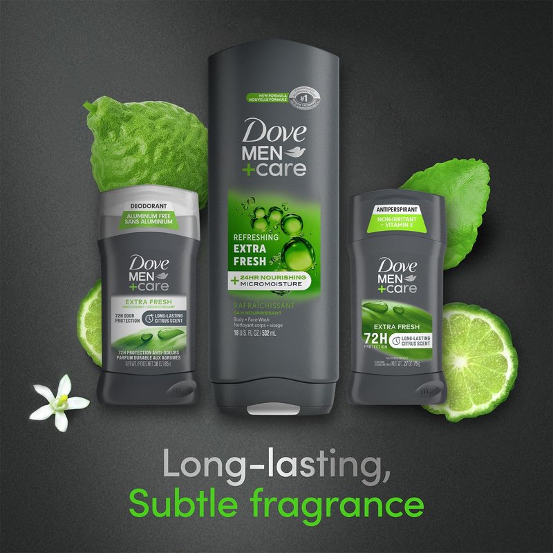Dove Men + Care Extra Fresh Bundle – Men’s Body Wash, Aluminum-Free Deodorant + Antiperspirant, 72H Protection, Citrus Scent (3 Piece Set)