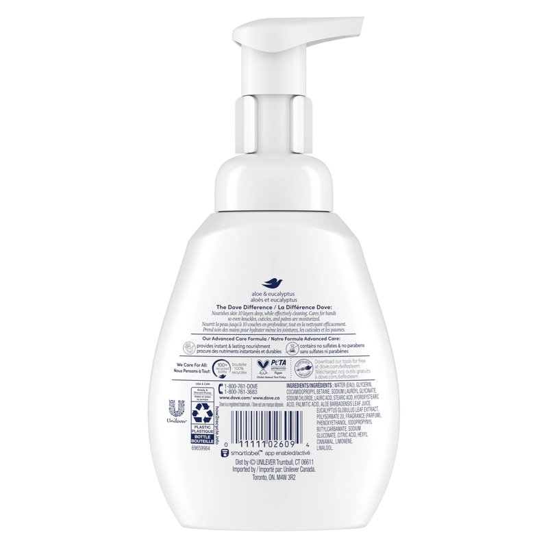 5x moisturizer blend. The Dove difference: This indulging hand wash is made with our 5x moisturizer blend consisting of 5 skin nutrients and moisturizers. Our rich foam softens and nourishes hands while effectively cleansing. Effectively cleans hands. No sulfate & no parabens. www.dove.com. how2recycle.info. SmartLabel: App enabled. Download our tools for free at dove.com/selfesteem. 1-800-761-DOVE. 1-800-761-3683. www.dove.com. Globally, Dove does not test on animals and is certified Cruelty-Free by PETA.