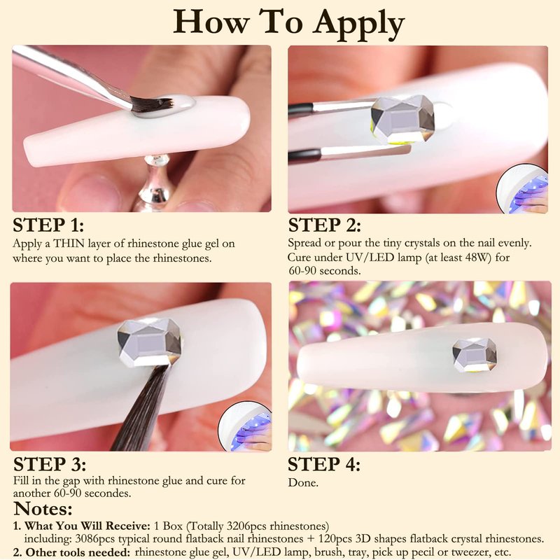 - ✅ What You Will Receive: 1 Box (Totally around 3206pcs rhinestones), including: 3086pcs typical round flatback nail rhinestones + 120pcs 3D shapes flatback crystal rhinestones. All rhinestones are made from high quality glass crystals, which is pure, solid and shine.