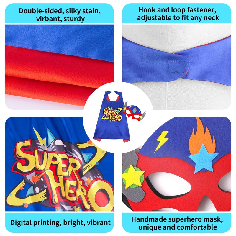 - Best Choice: Superhero cape and mask Set as a symbol of Superhero, perfect for School Program, Superhero Day, Birthday Dressing up Party, Camp, Halloween, Xmas, also as a perfect gifts to the little superhero.Whether it's party time, play time or trick-or-treat time, your kids will love the feeling of this wonderful superhero cape blowing in the wind.