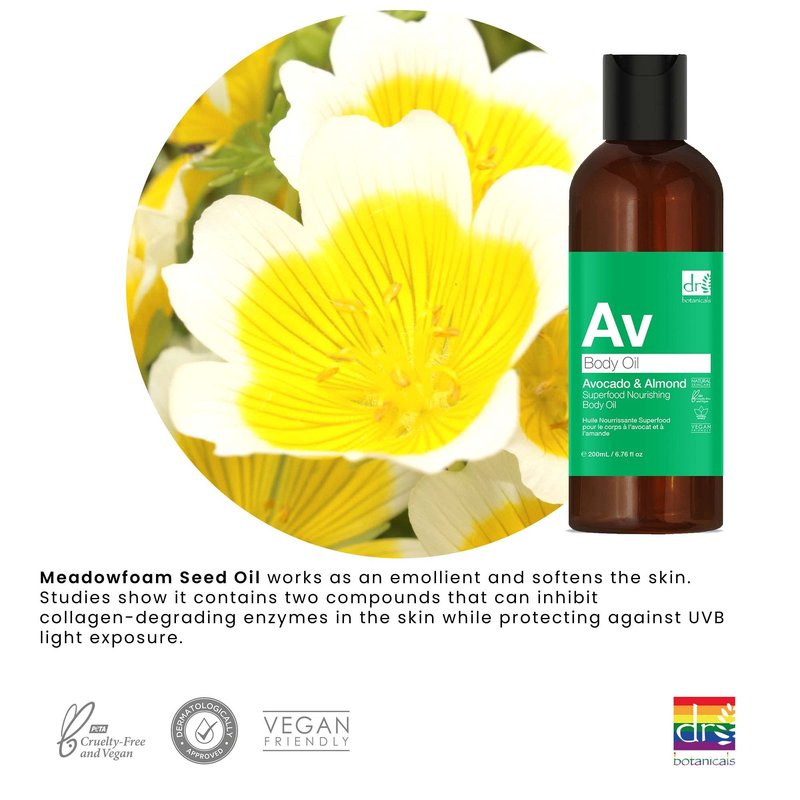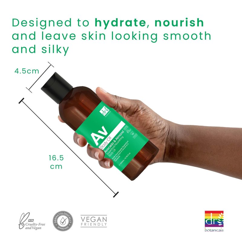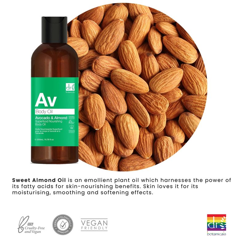 - Here we have the Dr Botanicals Apothecary Collection Avocado & Almond Superfood Nourishing Body Oil which is 200ml size and is a light oil enriched with natural vitamins and real fruit goodness which works to hydrate, nourish and leave skin looking smooth and silky.