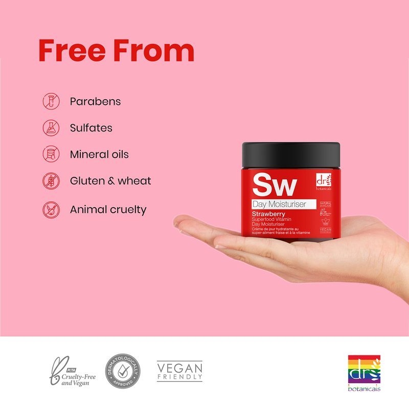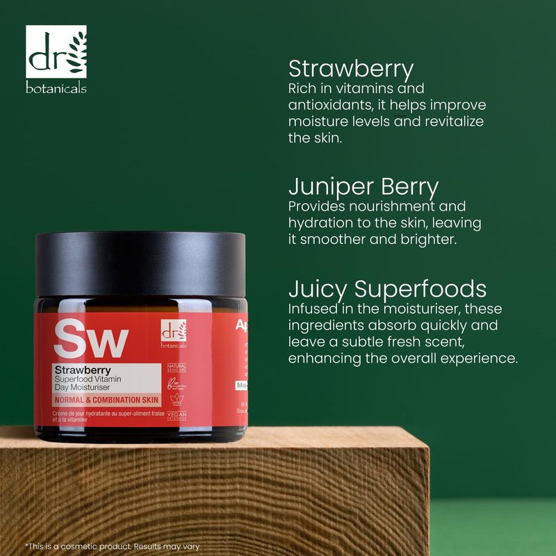 - Refresh your skin with juicy superfoods 🍓 Strawberry and Juniper Berry in this day moisturiser aiming to improve moisture levels for complexions in need of a boost