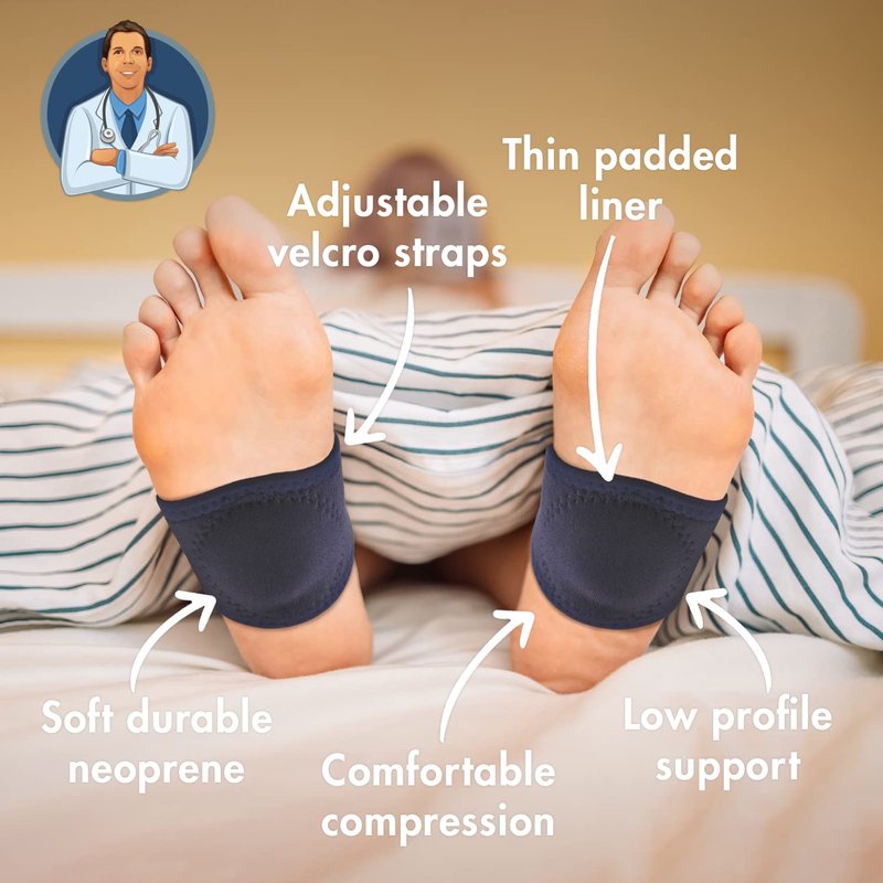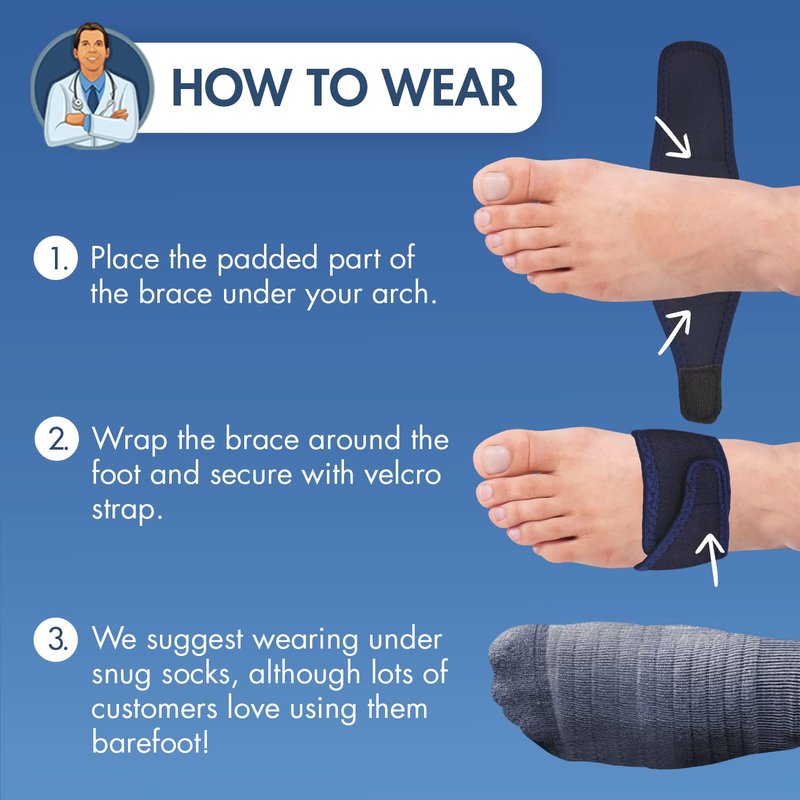 - Comfy Arch Support Brace: Our adjustable Arch Support Brace wraps comfortably around the foot, for compression and quick pain relief. Perfect for managing the symptoms of foot pain due to flat feet, plantar fasciitis, PES Planus, low arches, and unsupportive shoes.