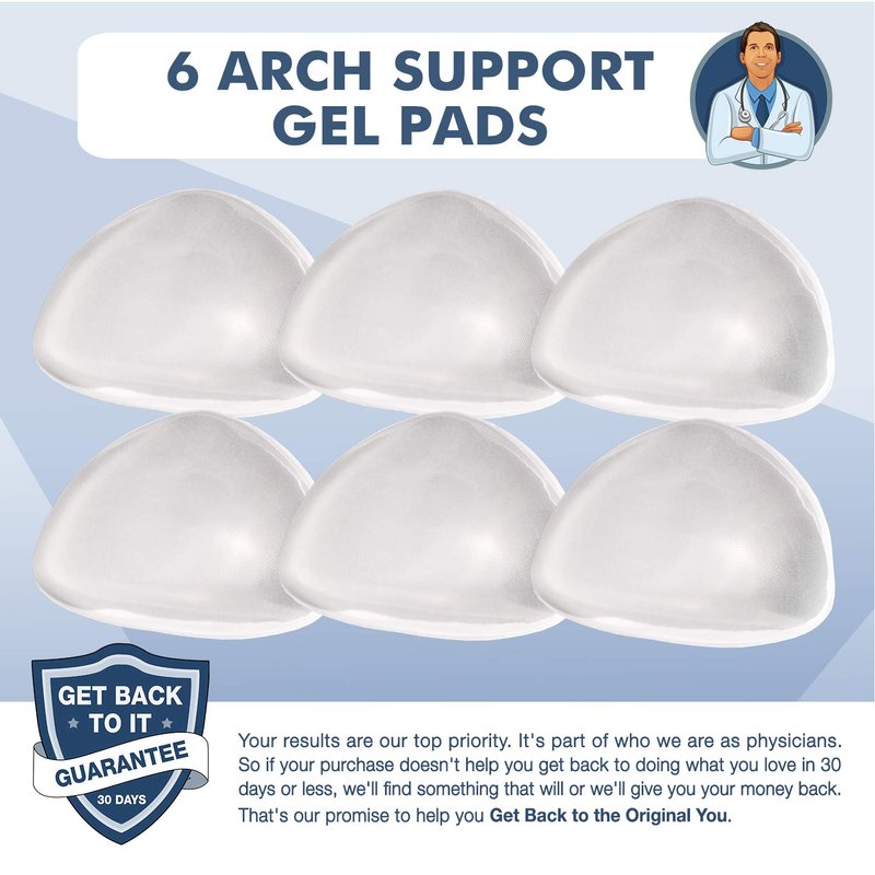 - 6 PEEL & STICK ARCH GELS: Our high arch supports are reusable and easy-to-clean. For the best results, put one pair in your favorite shoes and another in your sneakers. Wearing the gel pads frequently is the key to PAIN ALLEVIATION!