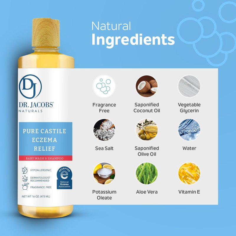 Dr. Jacobs Pure Castile Baby Wash for Eczema Relief, Effective Body Wash to Relieve Baby Eczema, Gentle Baby Shampoo, Unscented Soap for Baby's Sensitive Skin, and Hypoallergenic Baby Care -16 oz