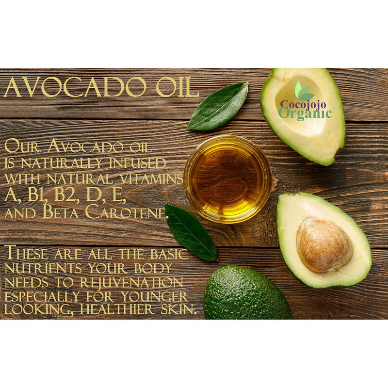 - Our Avocado oil is naturally infused with natural vitamins A, B1, B2, D, E, and Beta Carotene. These are all the basic nutrients your body needs to rejuvenation - especially for younger looking, hydrated skin.
