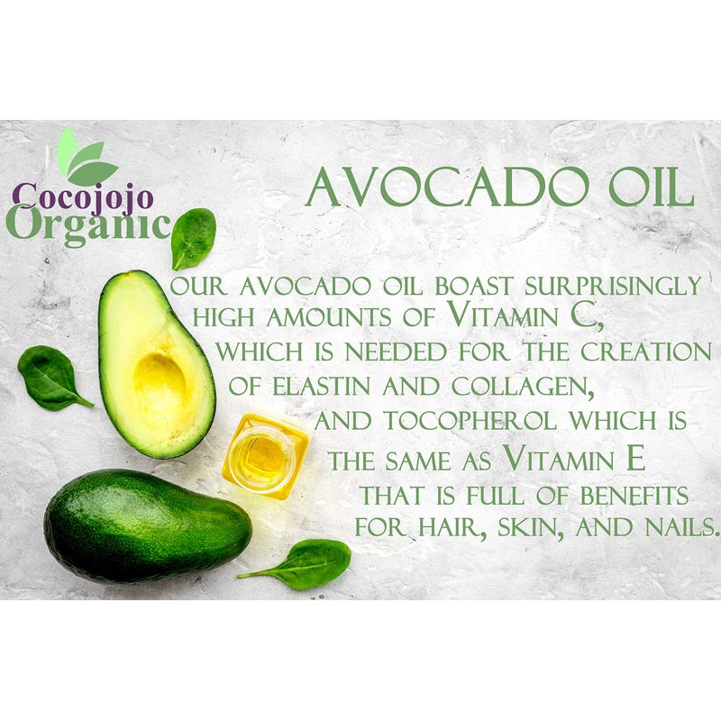 Our refined Avocado oil is cold pressed from the soft green flesh around the pit of the avocado, different than Avocado Seed Oil. Avocado oil is an emollient, highly penetrating oil that is great to use on dry skin. When used on the rough skin of knees and elbows, avocado oil helps nourish and soften the skin. The natural content of Vitamins A and E work synergistically to hydrate and nourish skin texture to for a smoother feel. The impressive nutritional profile of our refined Avocado oil makes it an ideal ingredient for inclusion in skin care recipes intended for dry, dehydrated and mature skin. Its notable content of unsaturated fatty and essential fatty acids also makes it ideal for inclusion in nourishing, moisturizing hair care formulations. Cocojojo's Refined Avocado oil is free of any fillers and additives, Pure and Natural, filtered and unscented. Never tested on animals and cruelty-free. Highly hydrating and absorbs quickly, excellent for relaxing massage while keeping skin nourished and moisturized. Our refined avocado oil is free of any color or scent making it perfect for cosmetic fomulation, used to dlute essential oils or just basic skin / hair care! Our Avocado oil is naturally infused with natural vitamins A, B1, B2, D, E, and Beta Carotene. These are all the basic nutrients your body needs to rejuvenation - especially for younger looking, hydrated skin. Along with this, avocados boast surprisingly high amounts of Vitamin C, which is needed for the creation of elastin and collagen, and tocopherol (Vitamin E).