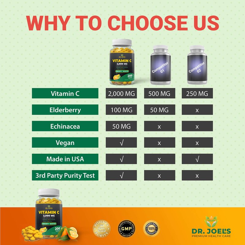 - ◆ 5-IN-1 IMMUNITY BOOSTER - With 27 years experience Dr JOEL'S have formulated the unique five in one formula of Vitamin C 2000 with Elderberry, Rose Hip, Zinc Gluconate & Echinacea to make the most powerful immune enhancer.