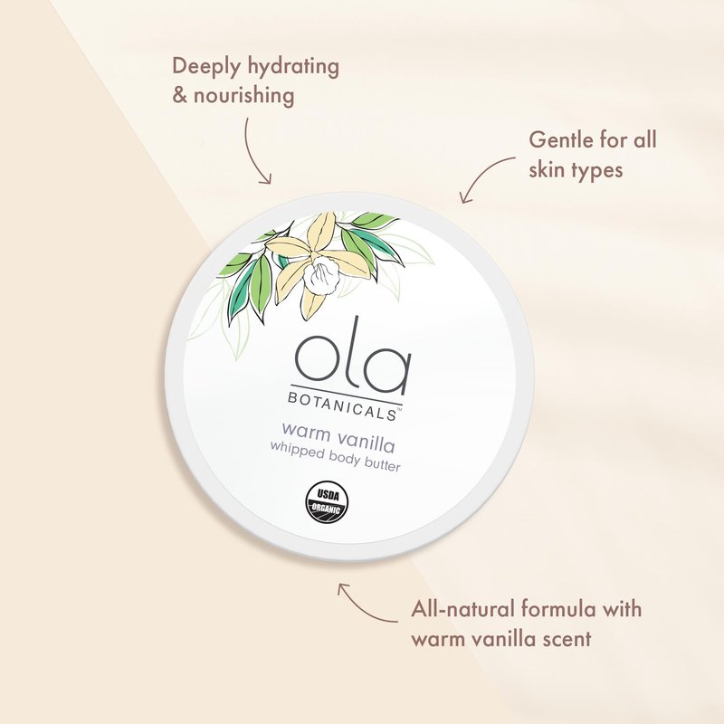 - Promote elasticity and hydrated, supple-feeling skin with Ola Botanicals Whipped Body Butter in Warm Vanilla, subtly scented with no artificial fragrances or parfums
