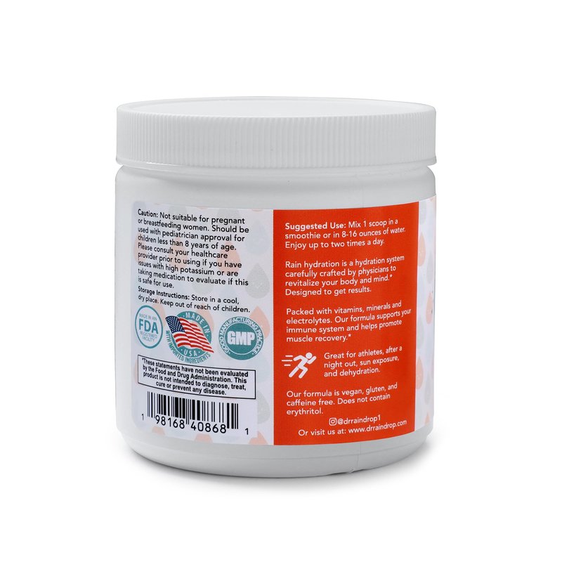 Introducing Dr. Raindrop Electrolyte Powder +Immune Support electrolyte drink powder, your ultimate hydration companion infused with a burst of blood orange goodness. Crafted meticulously by physicians, this premium blend energy drink powder is designed to rejuvenate and replenish your body, ensuring you stay energized and hydrated throughout the day. Packed with essential electrolytes crucial for muscle contraction and recovery, Dr. Raindrop electrolyte powder provides a superior hydration experience compared to water alone. Each serving of this hydration pack powder contains vital electrolytes including sodium chloride, potassium citrate, and magnesium glycinate, derived from premium sources like pink Himalayan salt, ensuring optimal muscle health and performance. It is a good source of B vitamins aiding in muscle recovery and brain health. But that's not all – our formula goes beyond mere hydration. With added immune-boosting properties including selenium, zinc, and elderberry, this hydration powder electrolyte helps fortify your body's defenses, keeping you feeling your best no matter what challenges come your way. Formulated by a nephrologist, Dr. Raindrop Electrolyte Mix Powder is free from added sugars, GMOs, artificial sweeteners, and erythritol, making it suitable for vegans and those adhering to a gluten-free lifestyle. Plus, with just 10 calories per serving, it's a guilt-free way to power up your day. Whether you're gearing up for a workout, recovering from a night out, or simply need a refreshing boost in the morning, Dr. Raindrop sugar free electrolyte powder is your go-to solution. Simply mix, sip, and feel the difference as your body recharges and revitalizes with every delicious sip of blood orange-infused hydration.