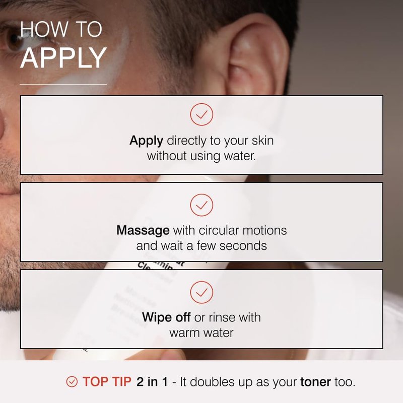 - Application: Use morning and evening to cleanse your face and neck. Apply Foaming Cleanser directly to your skin without using water. Massage with circular motions and wait a few seconds. Wipe off or rinse with warm water.