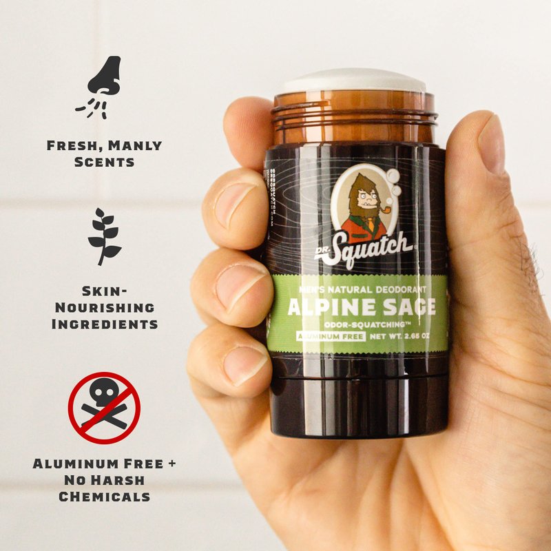 Dr. Squatch aluminum-free natural deodorant is made with only the finest ingredients Mother Nature has to offer for powerful protection and all-day freshness and confidence. We never use any harsh chemicals or synthetics like parabens,phthalates, or silicones and our fragrances are naturally-derived. Try all of the Dr.’s manly natural scents including Pine Tar, Fresh Falls, Birchwood Breeze, Bay Rum, Alpine Sage, and Wood Barrel Bourbon.